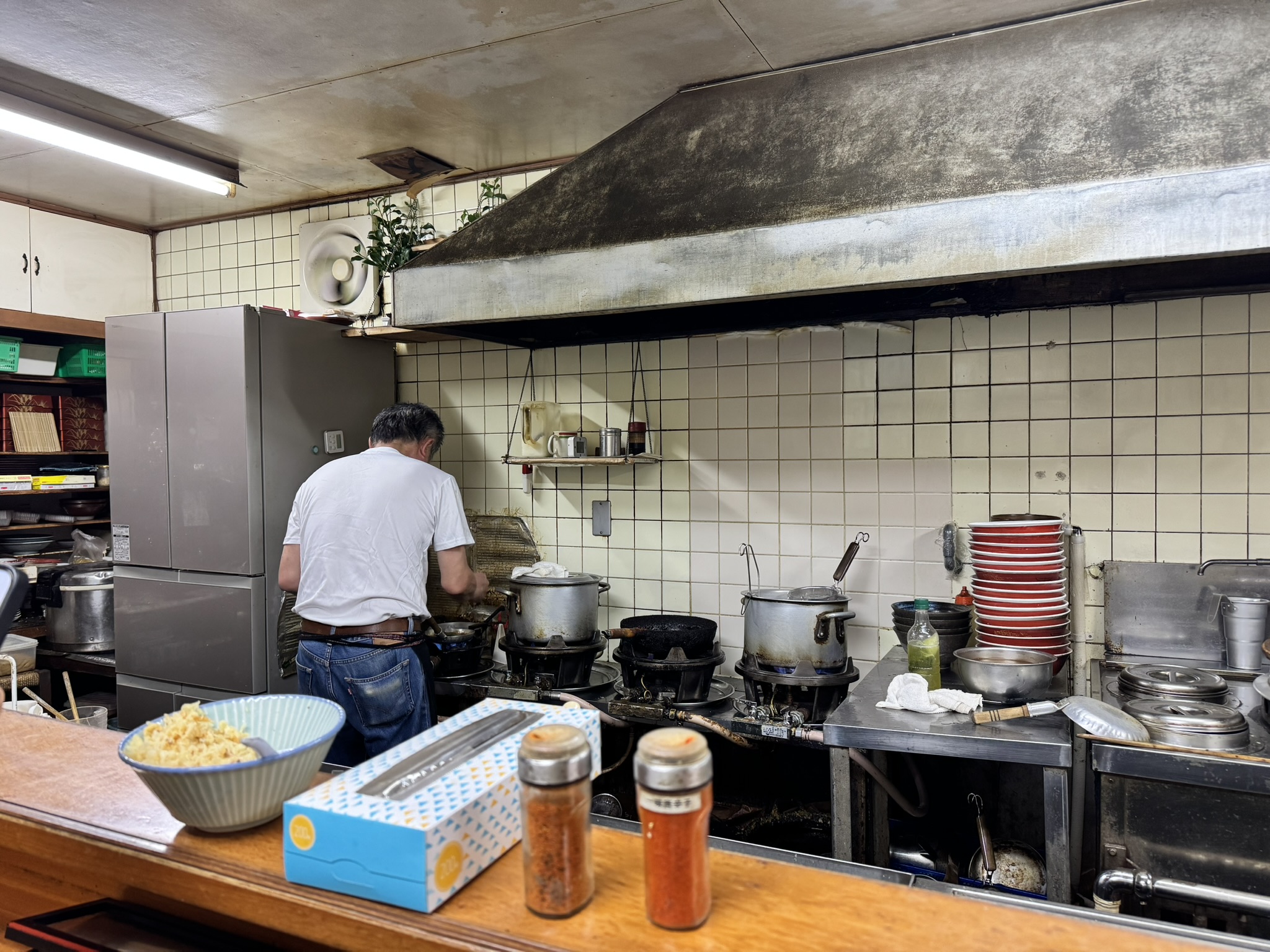 청바지에 흰 티셔츠를 입은 사장님이 쉴 새 없이 면을 삶고 국물을 내는 모습을 바로 앞에서 지켜볼 수 있습니다. 벽면에 걸린 스모 달력, 오래된 환풍기기, 그리고 질서 정연하게 쌓인 그릇들은 이곳이 단순한 식당을 넘어 누군가의 인생이 담긴 공간임을 느끼게 합니다.
