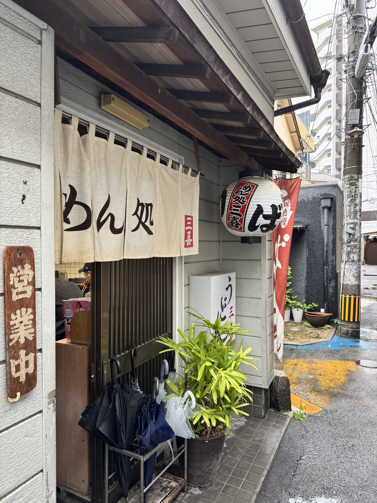 가게 입구에 걸린 흰색 노렌에는 'めん処(면 전문점)'라는 글씨와 함께 '三喜(미키)'라는 상호가 적혀 있습니다. 입구 옆 나무판에 적힌 '営業中(영업 중)' 이라는 팻말이 참 반갑습니다.